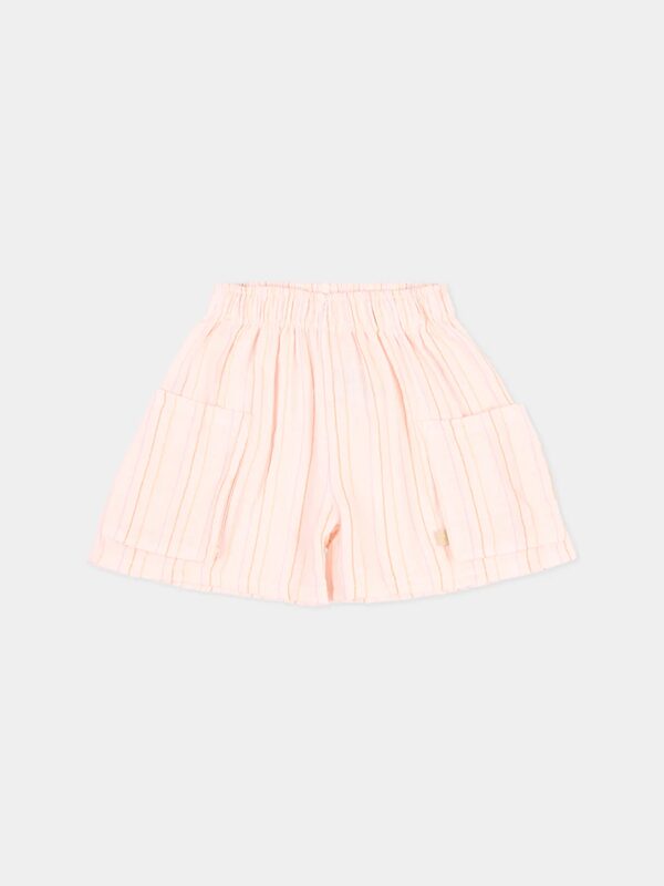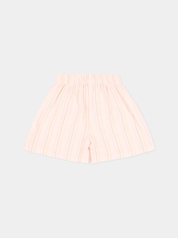 Shorts in cotone leggero Bamboom con base rosa e sottili righe multicolor dal gusto pastello. Vita interamente elasticizzata che avvolge il pannolino con comfort morbido. Ampie gambe svasate assicurano libertà di movimento, mentre le tasche applicate frontali aggiungono un dettaglio funzionale discreto. Orlo pulito e righe verticali completano un volume arioso e delicato.